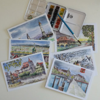 Einige der Skizzen habe ich mit Aquarellfarben koloriert und davon gefaltete Kunstkarten im Format A5 gedruckt. Diese können Sie (ohne Kuvert) zu einem günstigen Preis von CHF 4.–