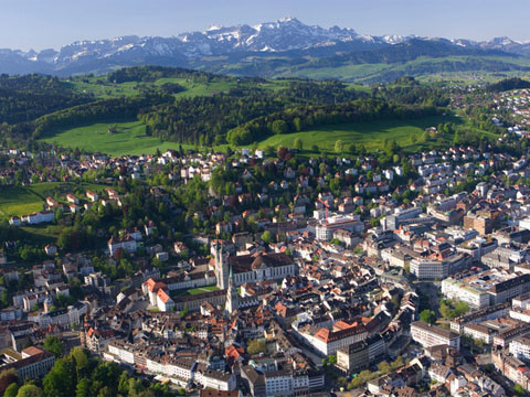 St. Gallen wurde im 7. Jhdt. gegründet und gilt heute als das kulturelle und wirtschaft-liche Zentrum der Ostschweiz. Sie zählt rund 74'000 Ein-wohner und ist mit rund 700 m.ü.M. eine der höher gelegenen Städte der Schweiz. St. Gallen liegt an der Steinach, einem Fluss, der in den Bodensee mündet. Wegen der speziellen Topografie wird St. Gallen auch die Stadt der «Tausend Treppen» genannt, da viele Treppen den Freuden- als auch Rosenberg hinauf führen. Sie wird auch als die «Stadt im Grünen Ring» bezeichnet, da auf den Hügeln vor der Stadt noch heute ausgedehnte Waldflächen als Naherholungsgebiete dienen. |