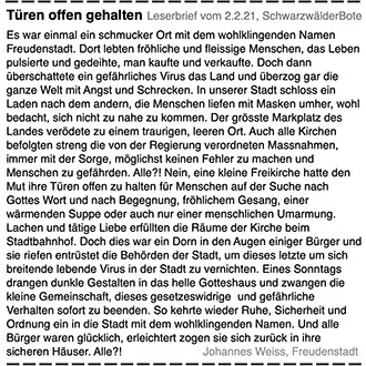 Dieser Artikel erschien am 2. Februar 2021 im Schwarzwälder Bote. Wie kommt es, dass diese Gemeinde während einer Pandemie weiterhin Gottesdienste anbietet, obwohl im ganzen Land angeblich der Notstand herrscht und die Intensivstationen überbelegt sind? Es scheint so, dass immer mehr Bürger mit den von der Regierung ergriffenen Massnahmen nicht einverstanden sind und die Normalität vor Corona wünschen. Am Tage der Beendigung des Gottesdienstes lag übrigens die Inzidenz bereits wieder unter 50 pro 100000, ein Verhältnis, der gemäss Definition der EU einer "seltenen Krankheit" entspricht. Das letzte Wort ist in dieser Sache noch nicht gesprochen...